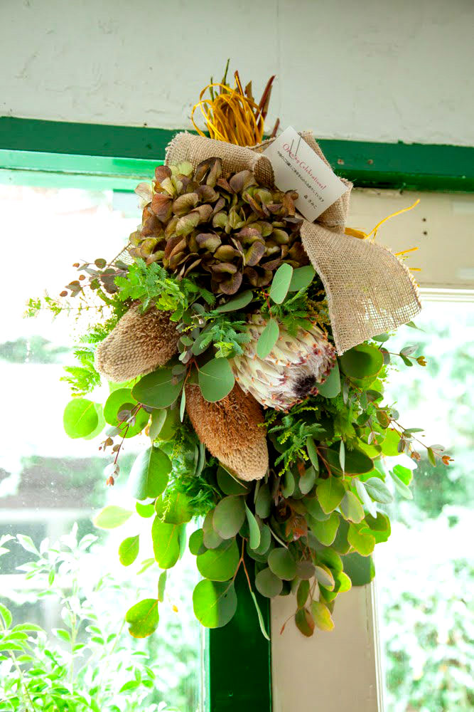 香りの良いユーカリを中心にグリーン系の花や植物を束ねたスワッグです。