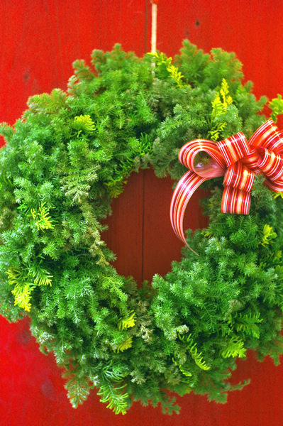 スギ科、モミ科の枝を中心に香りの良い針葉樹を巻き込んだリースです。クリスマスムードいっぱいのクリスマスリースです。壁やドアに飾って使えるようにアレンジしています。